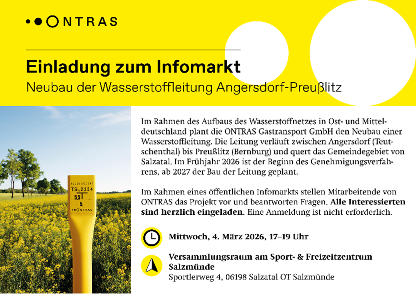 Am Mittwoch, den 4.3.2026 veranstaltet ONTRAS von 17 bis 19 Uhr im Versammlungsraum am Sport- und Freizeitzentrum Salzmünde (Sportlerweg 4 in 06198 Salzatal OT Salzmünde) eine Informationsveranstaltung für interessierte Bürgerinnen und Bürger der Region. Im Rahmen eines offenen Infomarktes stellen Mitarbeitende von ONTRAS das Leitungsprojekt vor und stehen für Fragen zur Verfügung. Alle Interessieren sind herzlich eingeladen. Eine Anmeldung für die Veranstaltung ist nicht erforderlich.