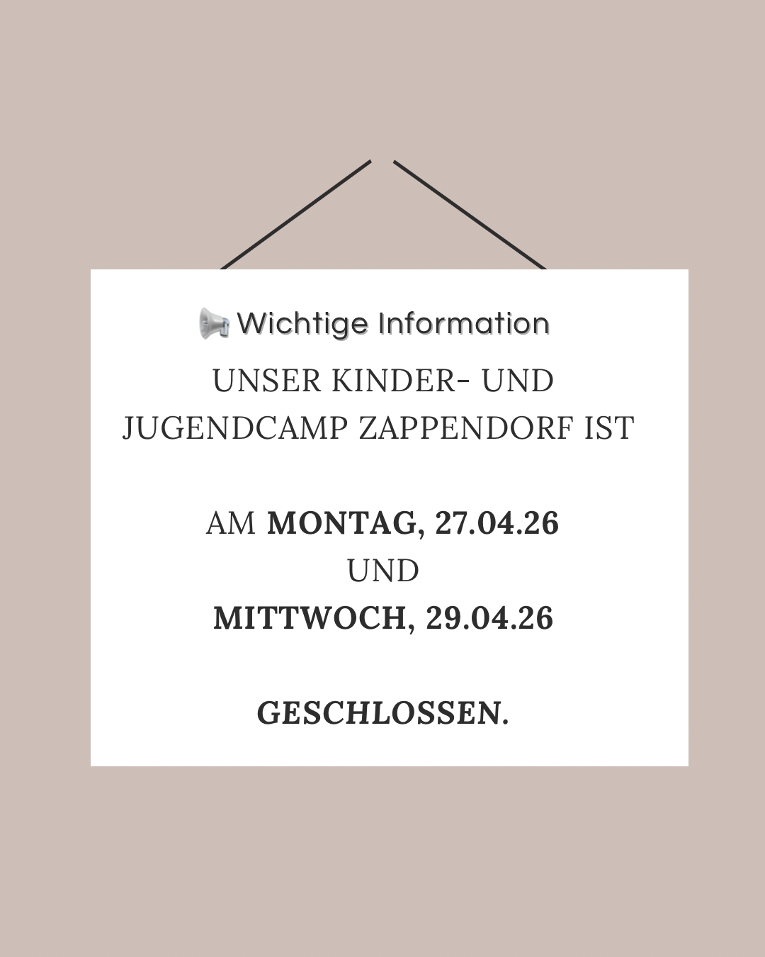 Das Kinder- und Jugendcamp Zappendorf bleibt am Montag, den 27.04.2026 und am Mittwoch, den 29. 04.2026 geschlossen!