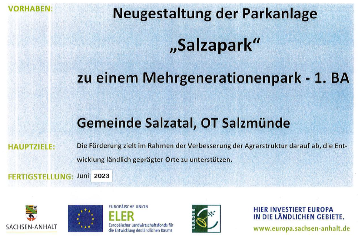 Das Projekt „Neugestaltung Mehrgenerationenpark Salzmünde“ wird aus Zuwendungen des Amtes für Landwirtschaft, Flurneuordnung und Forsten Süd (ALFF) nach RELE 2014-2020 und aus Spendengeldern des Kultur- und Heimatvereins Salzmünde e.V. (Saalesparkasse) sowie Eigenmittel der Gemeinde finanziert.