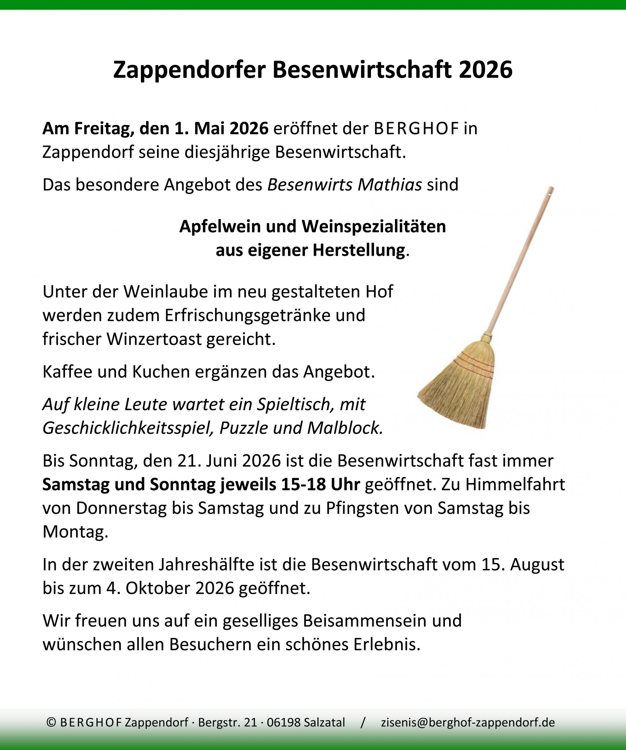 Zur Aufrechterhaltung und Förderung des kulturellen Lebens und des traditionellen Brauchtums in Salzatal veranstaltet der BERGHOF in Zappendorf auch in diesem Jahr eine Besenwirtschaft. Eingeladen wird von Mai bis Juni und von Mitte August bis Anfang Oktober 2026 jeweils Samstag und Sonntag und an Feiertagen zum geselligen Beisammensein bei hausgemachtem Wein, Kaffee und Kuchen zu moderaten Preisen. Höhepunkt der ersten Jahreshälfte soll ein musikalisches Programm mit Händelmusik zum 23. Zappendorfer Händel Weinblütenfest werden.