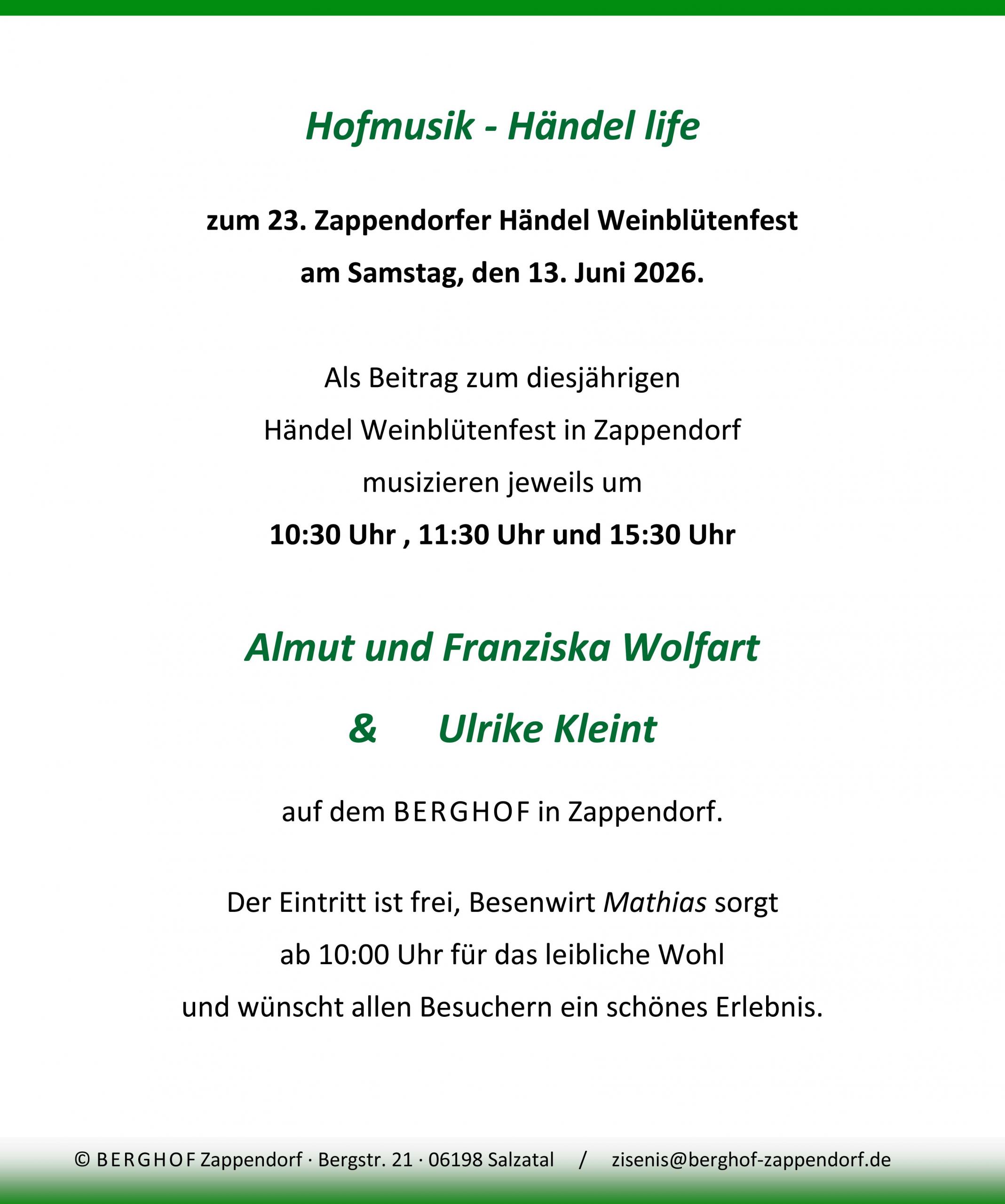Zum neuen Format des Zappendorfer Händel Weinblütenfests öffnen mehrere touristische Orte in Zappendorf ab 10:00 Uhr für Besucher; so auch die Besenwirtschaft auf dem BERGHOF. Hier werden zu verschiedenen Zeiten zwei Musikerinnen aus der Familie und eine Sängerin aus der Nachbarschaft ein kurzes Programm aus Musikstücken und Liedern des Komponisten vortragen. Hauswein und Hausgemachtes ergänzen die Hausmusik.